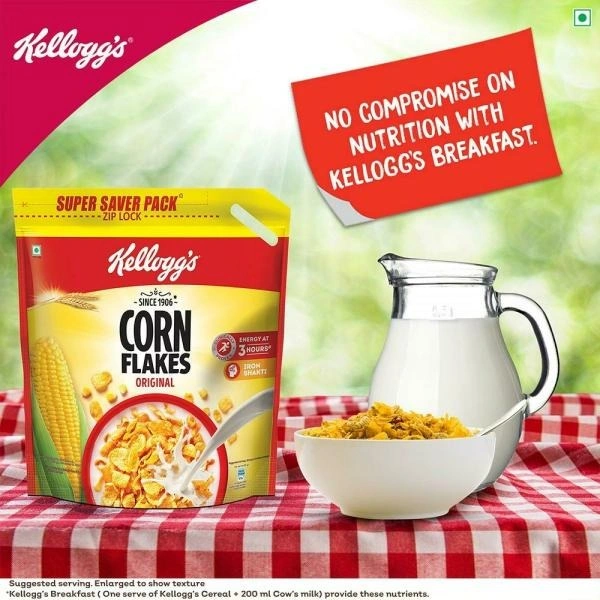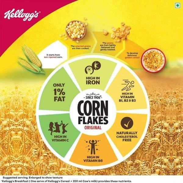 Kellogg's Corn Flakes is a nourishing breakfastcerealat its very best. Every bite of these crunchy, goldenflakesis just as delicious as the first. It is prepared fromcornand enriched with iron and 8 essential vitamins. You'll be on your way to a great day when you pour a bowl of Kellogg's Corn Flakes into your breakfast bowl. You can have it with hot/ cold milk and add some fruits and nuts for delicious taste. So go ahead, buy Kellogg's Corn Flakes online today and start your day on a healthy note.