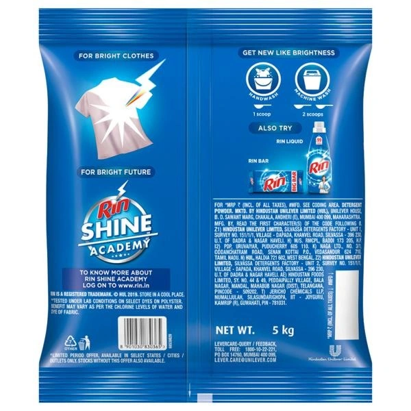 Powder detergent which makes clothes as bright as new. Easy dissolution formula that penetrates and removes the toughest dirt. Whether it's a big board meeting or your child's first speech at school, Rin Advanced Detergent Powder is your perfect laundry partner, ensuring your family's garments always looks crisp, bright and the best. The Yellow Fighters in Rin Advanced Detergent Powder penetrate deep into the fibers and remove stubborn dirt particles to give you flawless white clothes that help your loved ones shine! Get 'dazzling whites' & clothes that look 'Bright like new' with Rin Detergent . Rin Detergent Powder removes dirt from deep within the cloth fiber, thereby removing dullness from your clothes. Rin Detergent Powder comes with Bright Clean Technology, making your clothes look 'Bright like new'. Use 1 scoop of Rin for a bucket wash & 2 scoops of Rin for machine wash. Your Rin Detergent Powder is suitable for whites as well as coloured clothes. Keep your clothes shining 'Bright like new' with Rin Detergent Powder. Rin, Unilever's mid-tier laundry detergent brand, believes that everyone is talented and it is the lack of opportunities or prejudices of others that stand in the way. Rin believes that nothing should come in the way of your shine. Each one of you has the talent and deserves an opportunity to shine. Rin promises to make your clothes whiter and brighter, so that you can get the confidence to stride ahead on your journey to progress. Rin enables the people it serves, shine by giving them brighter cleaner clothes. The brand essence -Dress to Progress- captures the idea that bright clothes can help radiate confidence and open doors to progress. Never worry about those whites again, buy the Rin Advanced Detergent Powder in this big 5 kg pack, right away!