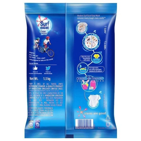 With Surf excel Easy Wash, now remove tough stains easily with the power of ten hands.We understand that washing clothes and removing stains can be extremely tiring and cumbersome. Especially if you are a mother of a young kid who fills your laundry basket with clothes covered in an array of stains, grass stains from football practice, ketchup stains from lunch and paint stains from art class. Until now you would have to soak your child's dirty clothes for a couple of hours and then scrub them with your hands using a brush and a bar, and wondered why it takes so much time and effort to remove stains from your kid's clothes? The answer is because regular detergents do not dissolve completely and don't work as effectively. Surf excel Easy Wash is a superfine powder that removes tough stains in a jiffy and leaves no residue on your clothes. Being a superfine and fluffy powder it dissolves easily and reaches the stain and removes it easily. Its engineered formula with a superior technology unleashes the power of 10 Hands that is effective in removing toughest of the stains such as mud, ink, oil, ketchup, curry stain and chocolate very easily.